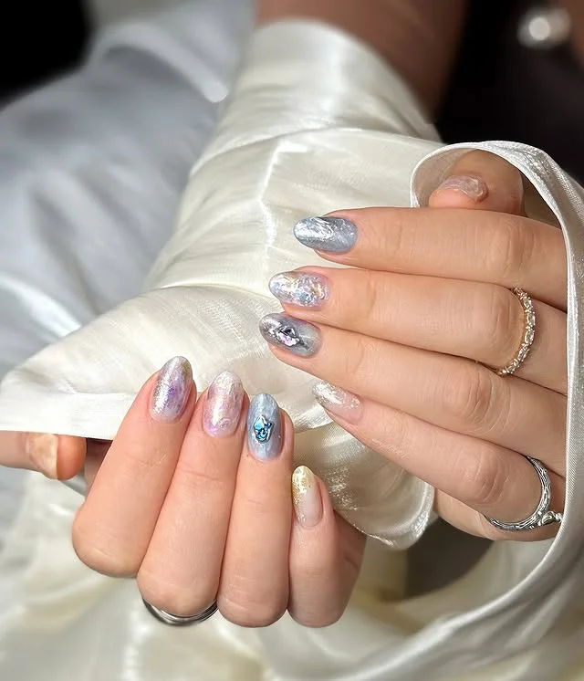 A dazzling mix of iridescent shades in silver, lavender, and pastel blue creates a magical holographic effect across the nails. Each nail features a slightly different reflective pattern, giving the manicure a unique, multi-dimensional charm. A subtle blue rose accent on one nail adds a personalized artistic detail that stands out beautifully.