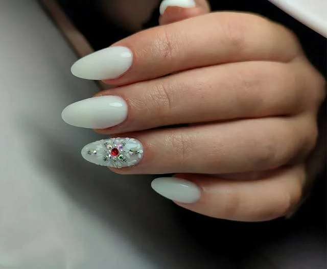 #22. White Oval Nails with Crystal Accent