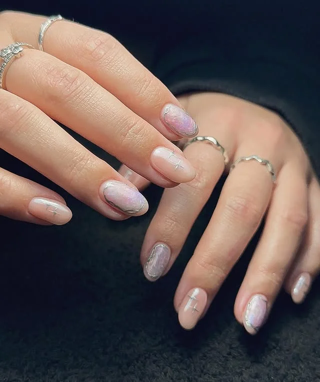 Gentle pastel tones in pink and lavender swirl together, forming a dreamy marble-inspired finish that feels soft and artistic. Subtle silver detailing adds a touch of refinement, balancing the whimsical effect with structure. The muted colors make the nails versatile, working equally well for daytime elegance or nighttime charm.