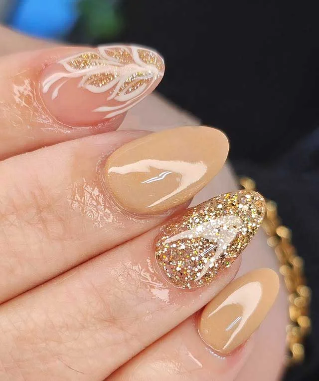 Warm beige tones dominate this set, bringing a polished and sophisticated vibe. A glittering gold nail acts as the highlight, catching light from every angle and adding a glamorous sparkle. The accent nail with gold and white leaf-inspired details ties the look together with subtle artistry.