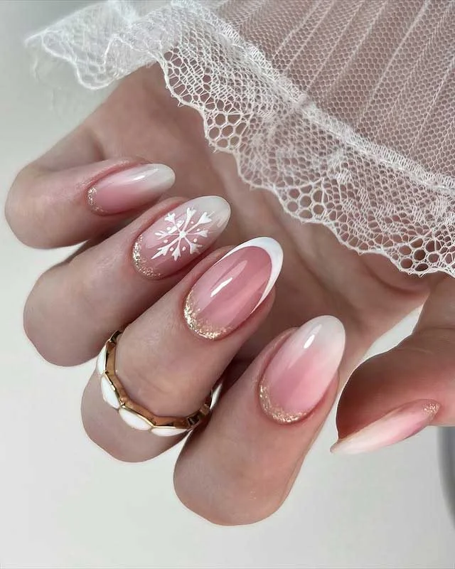 Gradient pink shades blend seamlessly into soft white tips, creating an ombre effect that feels delicate and dreamy. A single snowflake design becomes the centerpiece, giving the manicure a seasonal and elegant touch. Subtle gold shimmer along the cuticles frames the design beautifully, adding warmth and glow.