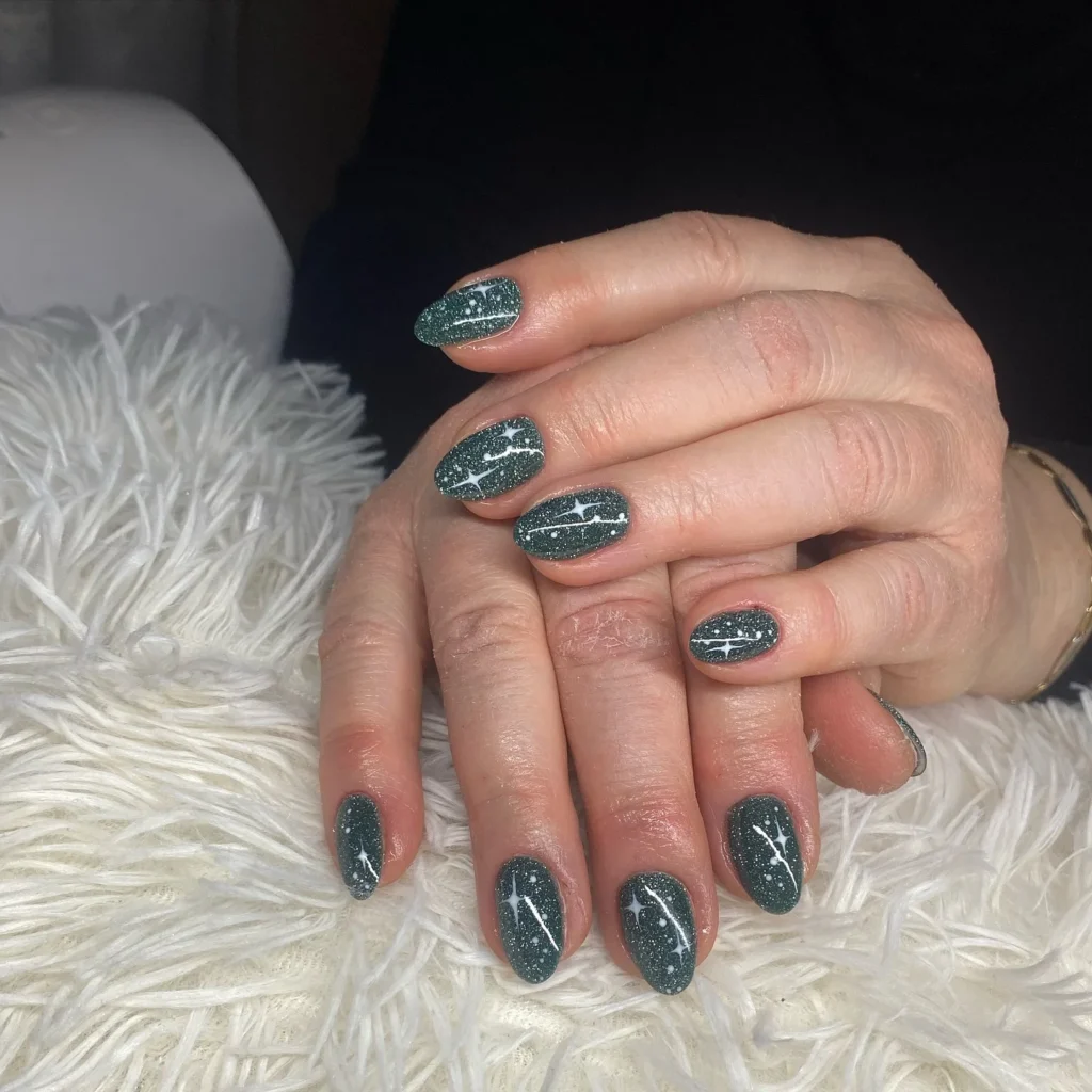 Dark green nails sparkle with fine glitter, mimicking the beauty of a starlit night sky. White constellation-inspired line art stretches across the surface, creating a cosmic, dreamy aesthetic. Each nail tells its own celestial story, making the design feel artistic and one of a kind.