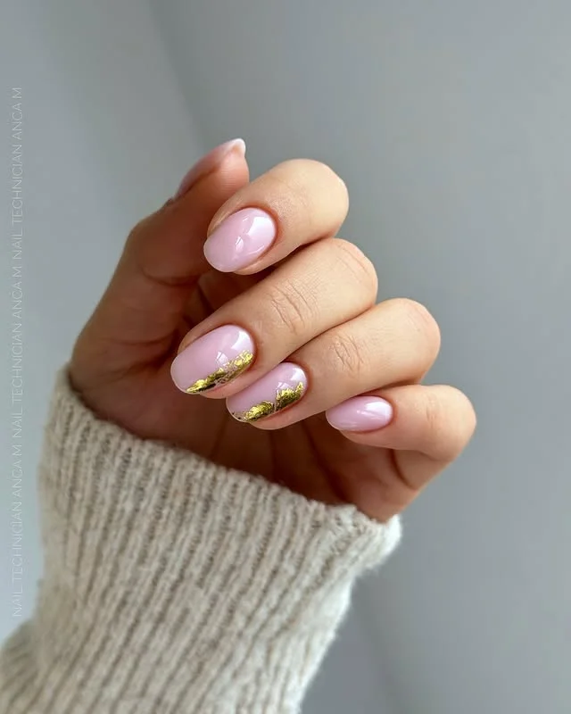Delicate pastel pink polish forms a graceful base that radiates femininity. Shiny gold foil is placed artfully along the edges, adding luxury and texture to the overall look. The balance between soft pink and metallic gold creates a sophisticated yet playful finish.