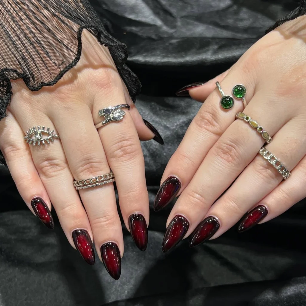 Sharp and daring, these stiletto nails blend a blood-red base with glossy black tips. The gradient resembles crimson dripping into darkness, creating a vampiric effect. Each nail looks like a dagger dipped in blood, amplifying the gothic aesthetic.