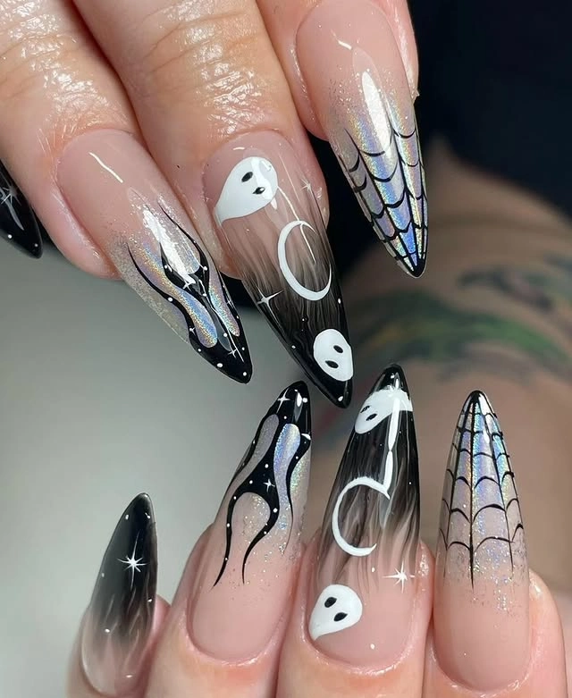 These stiletto nails combine ethereal beauty with gothic symbolism. A nude-to-black gradient is accented with holographic flames, crescent moons, and ghost illustrations. The shimmering finish adds a celestial glow, making the ghosts and moons appear to float.