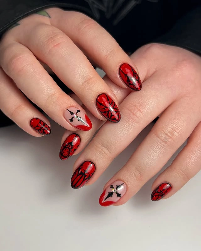 These oval-shaped nails feature a striking blood-red base with contrasting black gothic motifs. Stylized roses and stained-glass-inspired patterns give them an elegant cathedral-like feel. A few nails showcase black crosses set against nude cutouts, adorned with tiny rhinestones for added drama.
