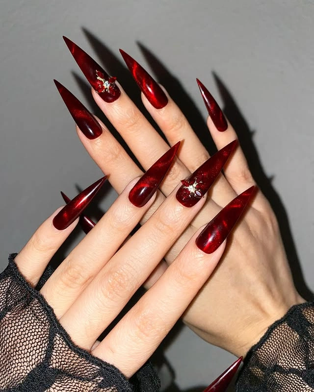 Dramatic and fierce, these ultra-long stiletto nails feature a glowing crimson base with a glossy, marble-like finish. The sharp dagger shape enhances their vampiric energy, while jewel accents on select nails add a sparkling touch. Their deep, blood-red tone reflects gothic glamour at its most powerful.
