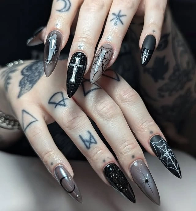 A mix of matte gray, glossy black, and glitter creates a multidimensional gothic design. Spiderwebs, crescent moons, and silver cross motifs decorate the stiletto nails, each one offering a unique detail. The blend of mystical symbols and dark tones makes them feel enchanting and ominous.
