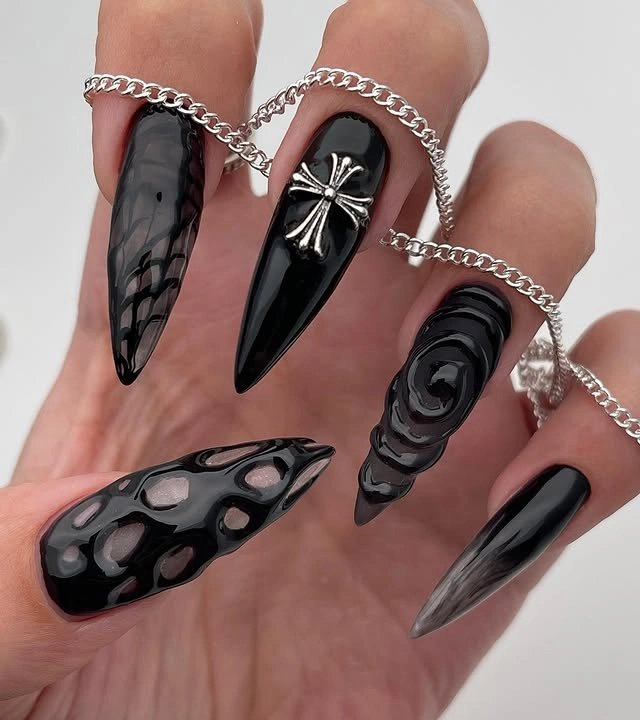 Glossy and sculptural, these stiletto nails showcase an all-black gothic look with raised 3D designs. Each nail features a different texture, from swirls and cutouts to rose-inspired shapes. A single nail is adorned with a silver gothic cross, enhancing the theme with metallic detail.