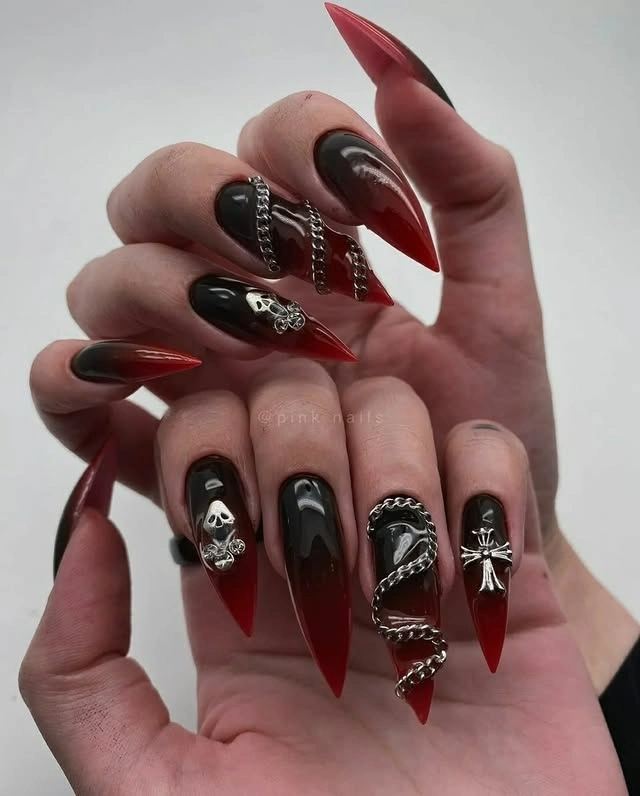 These long stiletto nails blend glossy black with blood-red tips for a vampiric ombre effect. Adorned with silver chain accents, tiny skull charms, and gothic crosses, each nail feels like a statement piece of gothic jewelry. The combination of sharp tips and metallic embellishments adds a rebellious, dangerous energy.