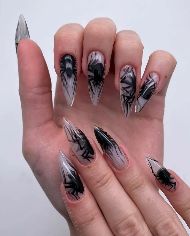 Featuring a translucent smoky gray base, these nails are decorated with black spider silhouettes crawling across each nail. The elongated stiletto shape enhances the eerie aesthetic, making them feel hauntingly elegant. The misty base gives the illusion of shadowy fog, while the spiders bring a chilling gothic twist.