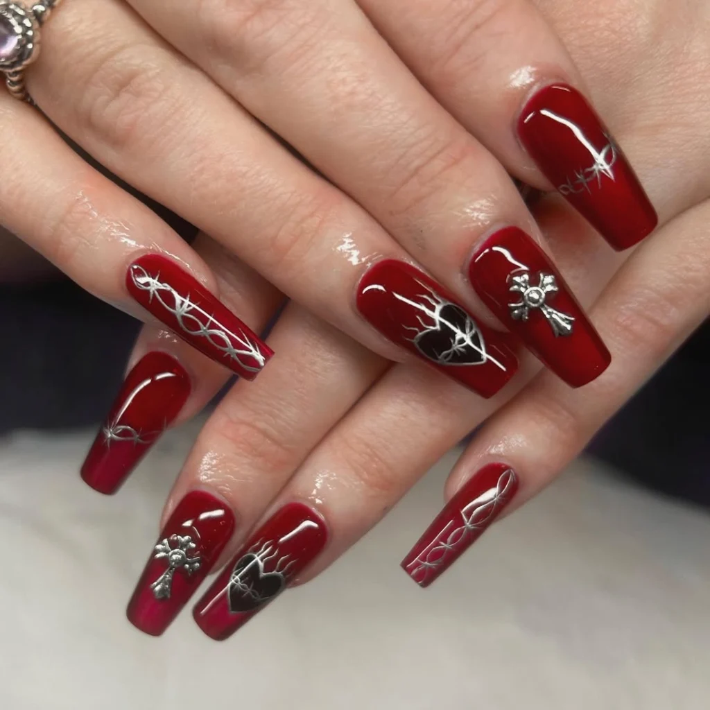 These coffin-shaped nails showcase a striking crimson base adorned with metallic silver artistry. The barbed wire designs create a rebellious, edgy vibe, while the silver heart and gothic cross charms add a touch of dark romance. Glossy and dramatic, they embody strength and vulnerability all at once.