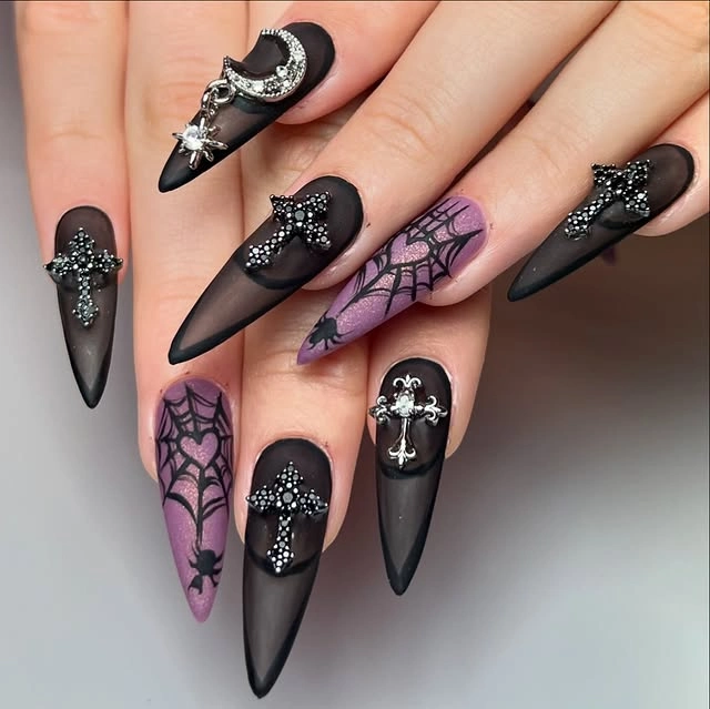 These stiletto nails combine matte black tips with lavender accents for a hauntingly elegant base. Spiderweb patterns stretch across several nails, detailed with tiny black spiders for a spooky gothic vibe. Metallic cross charms and a dangling crescent moon add striking 3D elements, giving the set a bold, jewelry-like quality.