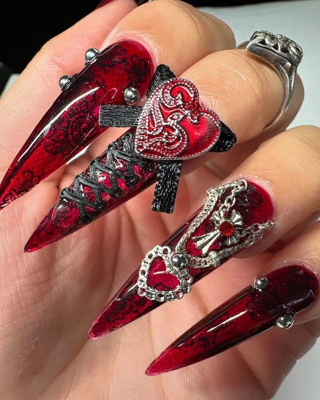 These dramatic stiletto nails feature a deep red base with a glossy black lace overlay, reminiscent of gothic corsetry. Black ribbon laces crisscross along one nail, while others are adorned with intricate 3D hearts and metallic gothic cross embellishments. The shimmering red background adds a seductive, vampiric edge, while the textures bring dimension.
