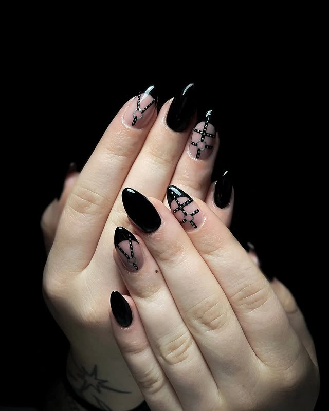 Simple yet impactful, these almond-shaped nails feature a glossy black finish paired with minimalist nude bases. Black studs form geometric crisscross and V-shaped patterns, giving a subtle nod to gothic elegance. The sleek contrast of nude and black makes them versatile yet striking, offering a clean gothic look that feels modern.