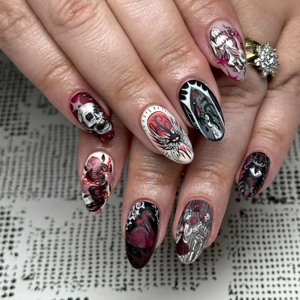 Every nail is transformed into a miniature canvas, showcasing detailed gothic tattoo-inspired art. From skulls and demons to dark angels and occult symbols, the designs are meticulously painted with red, black, and ivory tones. The level of detail mirrors gothic body art, making them look like living illustrations.