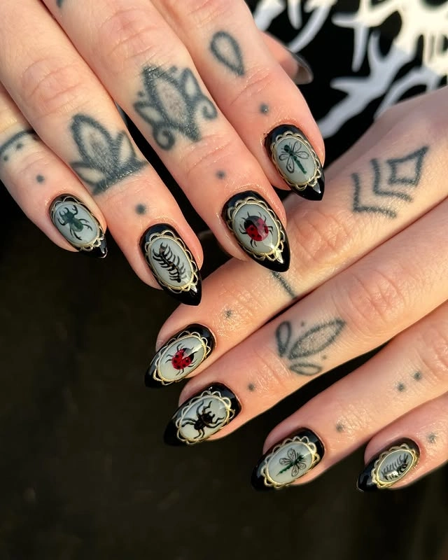 These nails resemble framed antique curiosities, each bordered by ornate black and gold frames. Inside, delicate illustrations of beetles, dragonflies, and ladybugs sit against muted, vintage-inspired backgrounds. The design feels like relics from a gothic apothecary, preserved under glass. Elegant yet eerie, they celebrate the beauty of nature while adding a dark, mysterious undertone.