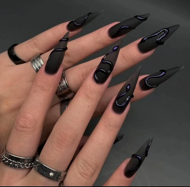 bold mix of texture and depth, these stiletto nails feature a smooth matte black base with raised 3D glossy accents. The fluid, curved shapes seem almost alive, twisting like streams of shadow. Subtle purple reflections add a futuristic, supernatural glow to the design.