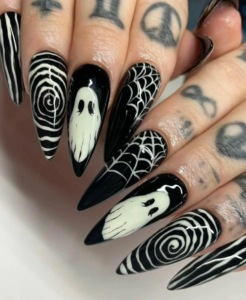 These stiletto nails are painted in stark black and decorated with white gothic motifs. Spirals, spiderwebs, and ghostly figures create a spooky yet stylish look. The monochrome palette keeps them classic, while the detailed artwork adds personality and intrigue. Each nail feels like a piece of gothic storytelling, perfect for a haunting, dramatic aesthetic.