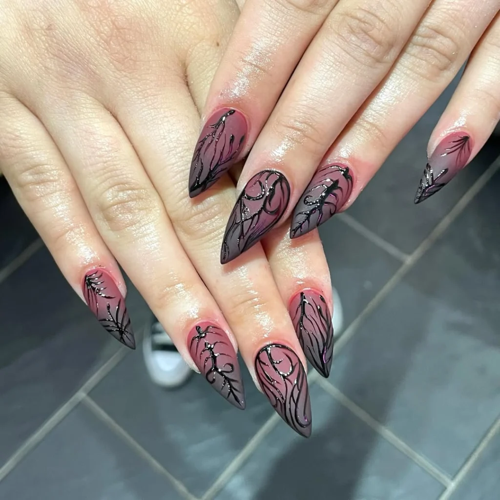 A softer take on gothic elegance, these nails feature a smoky mauve gradient with delicate black swirls. The feather-like designs mimic flowing shadows across the surface, adding movement and mystery. Glossy yet muted, they strike a balance between romantic and eerie.