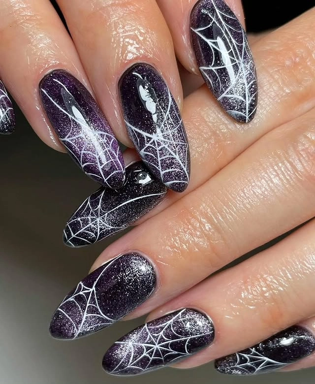 Sparkling like a night sky, these purple-black nails shimmer with a cosmic glitter effect. White spiderwebs stretch across each nail, adding a haunting gothic touch. The combination of sparkle and dark motifs creates a look that is both glamorous .