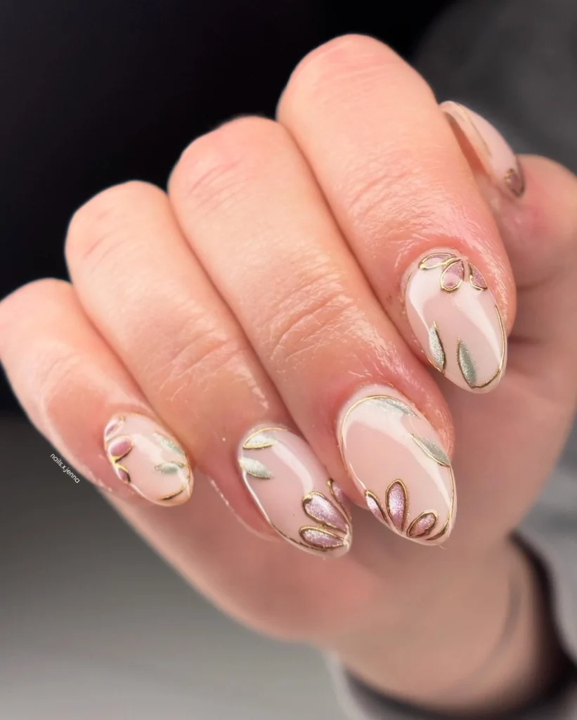 #10. Short Nude Nails with Metallic Floral Outlines