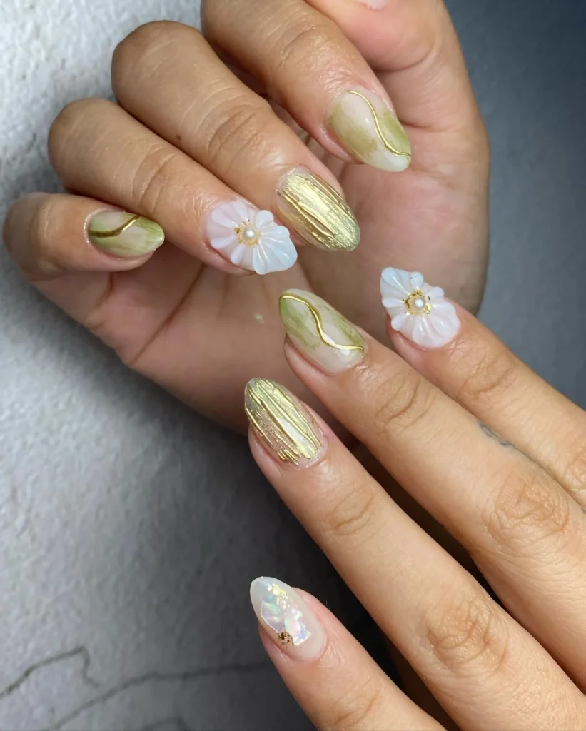 A luxurious combination of gold strokes, marble-inspired accents, and 3D white flowers transforms these nails into a piece of bridal art. The almond shape enhances elegance while the raised floral embellishments add texture and dimension. Soft nude tones ensure the design feels romantic, while hints of metallic bring glamour.
