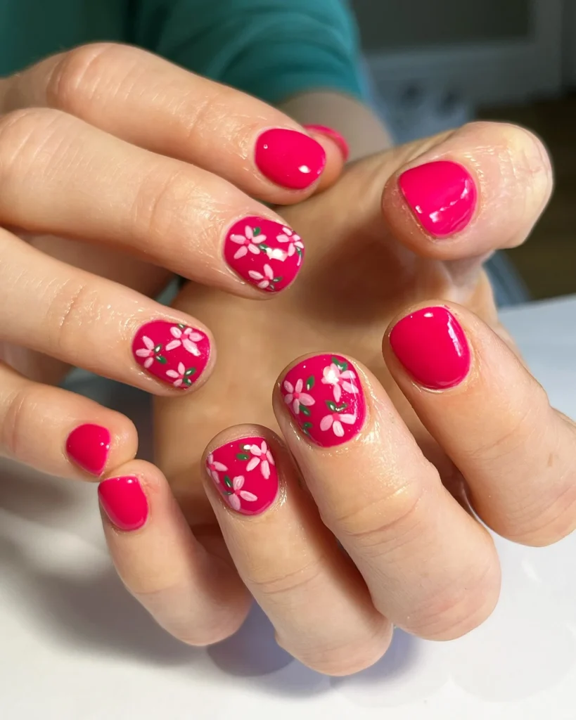 #16. Bright Pink Short Nails with Floral Art
