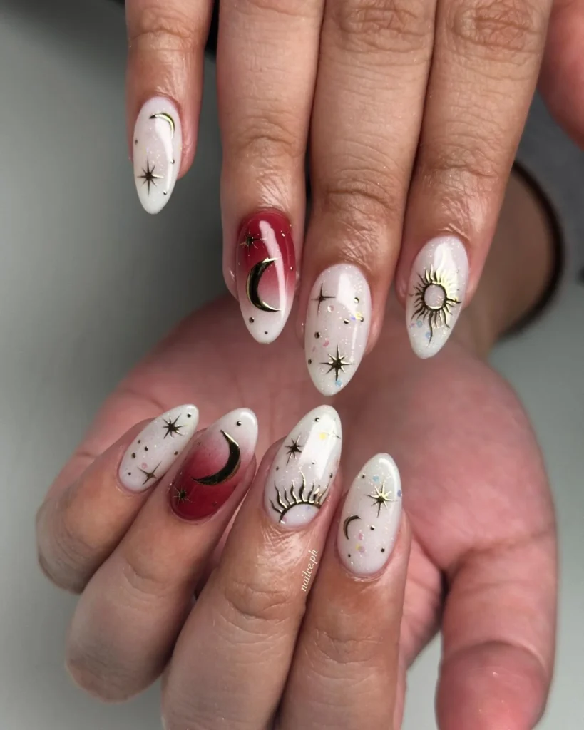 A dreamy manicure featuring moons, stars, and sun motifs in golden accents across a soft ombre base. Rich red highlights on select nails add depth and contrast, making the celestial theme even more striking. The almond shape elongates the fingers while keeping the look graceful.