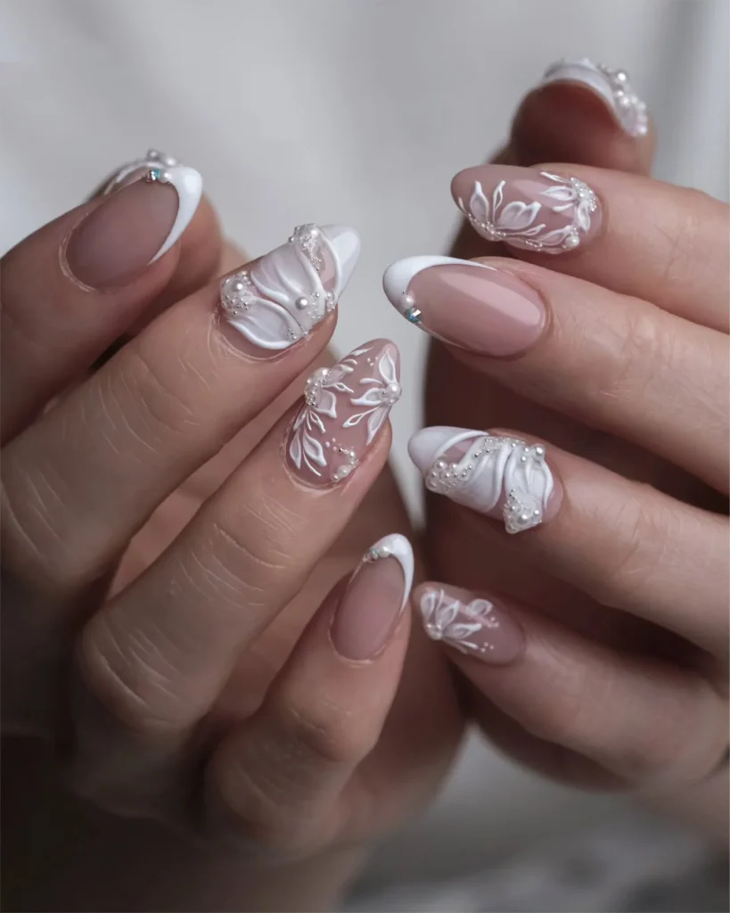 Intricate 3D floral appliqués paired with delicate pearl embellishments make this manicure truly breathtaking. A French base gives it structure while the raised detailing adds luxury and artistry. The design is both romantic and bold, ensuring it stands out in close-up shots of the bridal bouquet or ring.