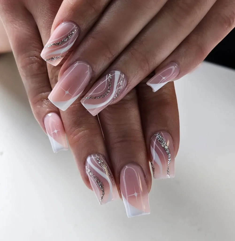 A timeless French manicure is elevated with flowing silver glitter waves that create movement and sparkle. The crisp white tips are softened by the addition of curved glitter lines, blending tradition with modern artistry. Short square nails give a clean and chic finish, making this look comfortable for brides while still photogenic.