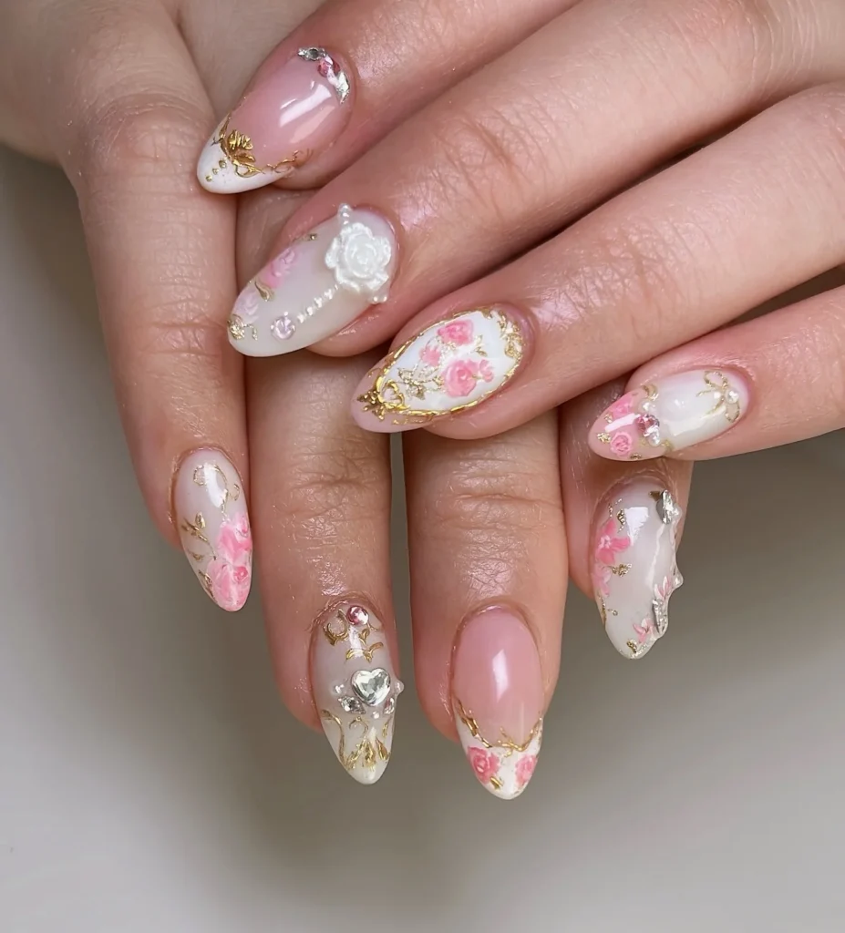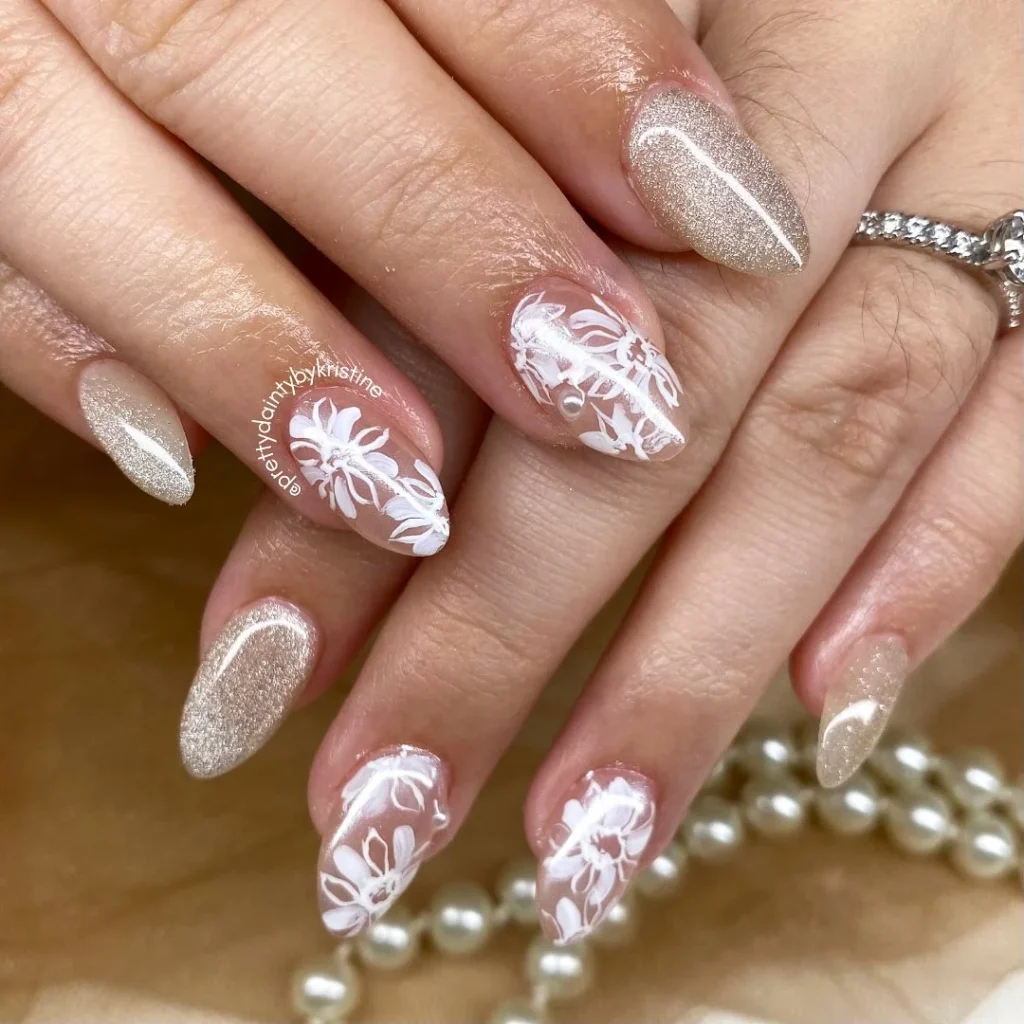A luxurious mix of champagne glitter and hand-painted white floral details gives this manicure a sophisticated bridal vibe. Some nails are kept shimmering while others feature intricate floral art, creating balance and variety. The almond shape adds refinement, making the nails look delicate yet glamorous.