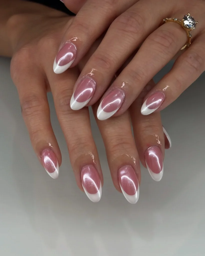 A soft blush pink shimmer forms the base of this elegant French manicure, giving it a radiant, pearl-like glow. The crisp white tips create a timeless contrast that instantly feels bridal and refined. The almond shape enhances the natural elegance of the hands, making them appear graceful and elongated.