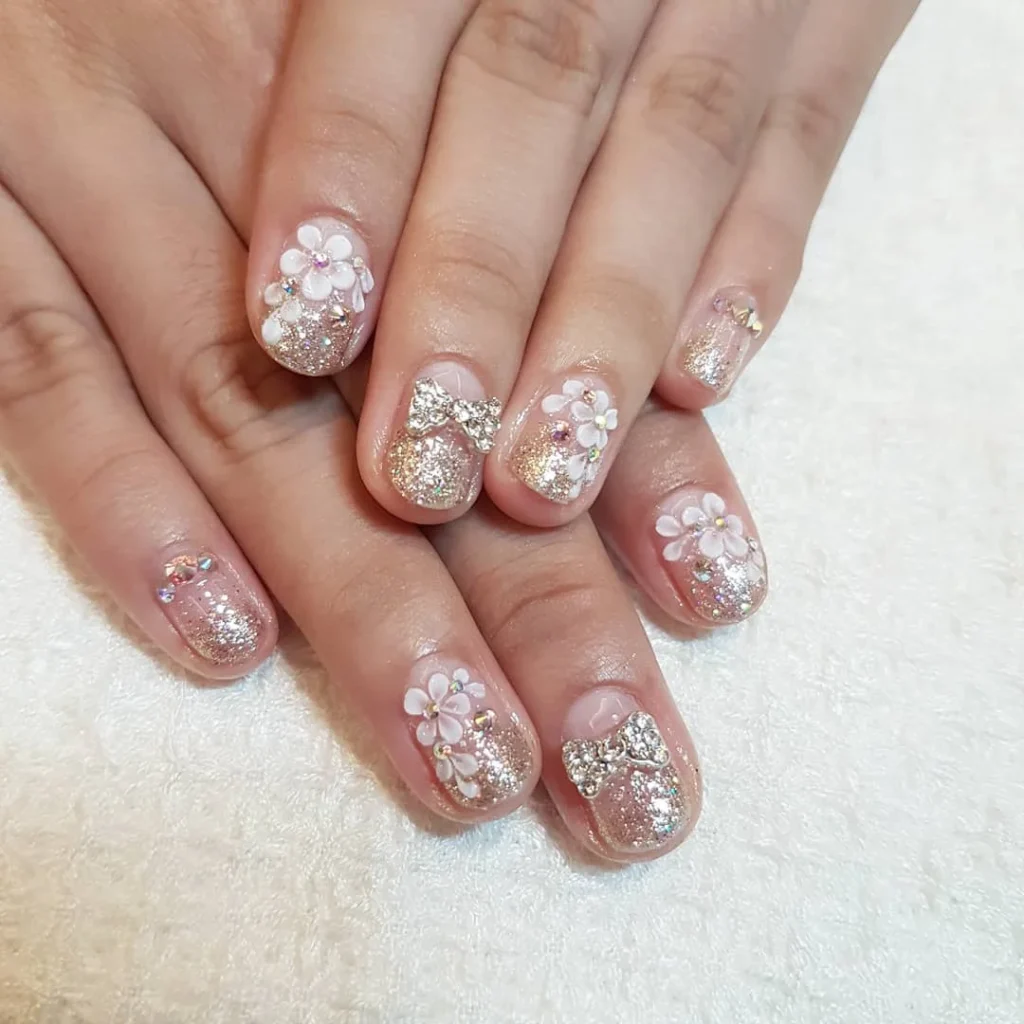 #23. Glittery Short Nails with 3D Flowers and Bows