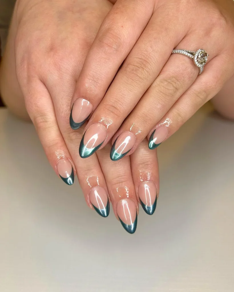 A bold metallic green French tip transforms the classic manicure into something unique and striking. The shimmer reflects beautifully, adding depth and dimension to the nails while still keeping a polished bridal vibe. The almond shape elongates the fingers, giving an elegant hand silhouette that looks great in photos.