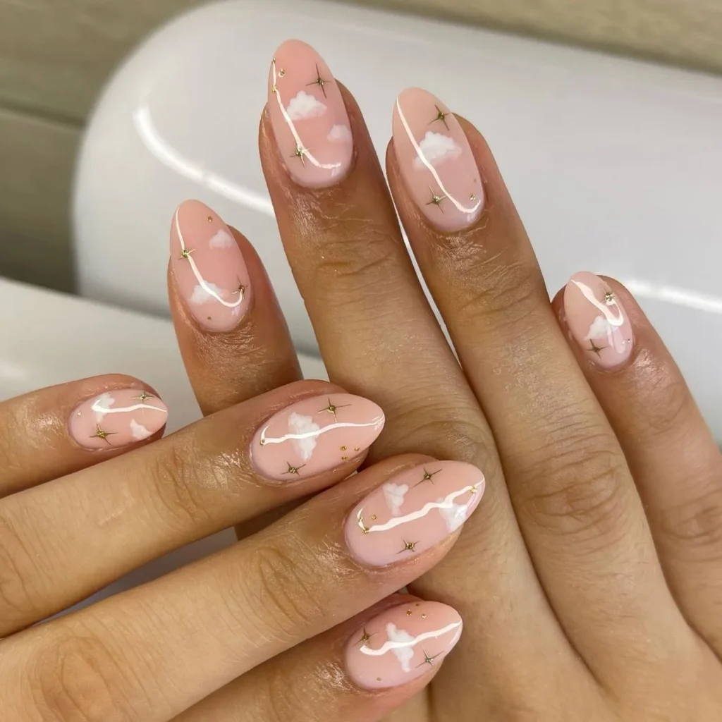 A dreamy pink base sets the stage for soft cloud designs paired with dainty golden stars. The whimsical details make the nails feel magical, perfect for brides who want their manicure to tell a romantic story. The almond shape adds elegance, while the celestial design creates a sense of playfulness.