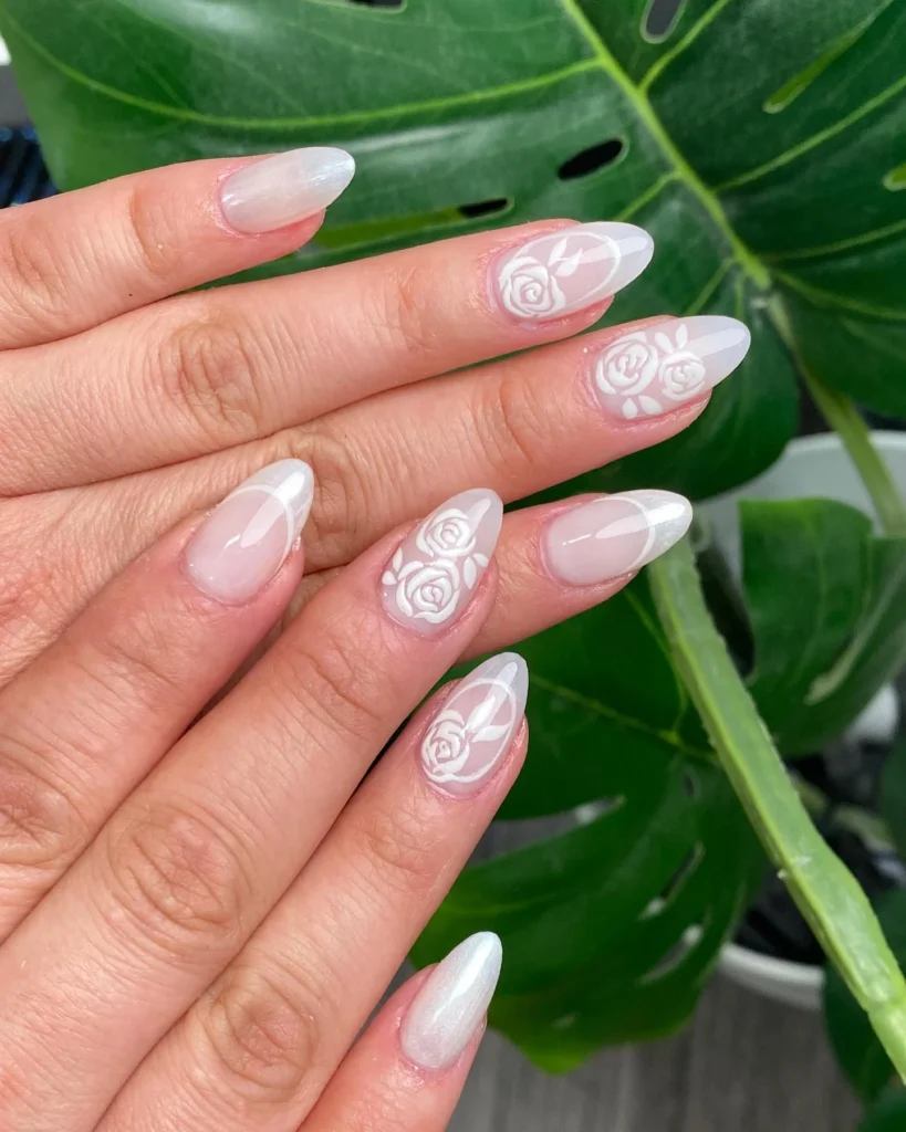 Hand-painted white roses bloom delicately across a soft nude base, symbolizing romance and elegance. Each floral detail feels graceful, making the nails look like a natural extension of bridal beauty. The almond shape elongates the fingers, creating a refined hand silhouette that pairs perfectly with an engagement.