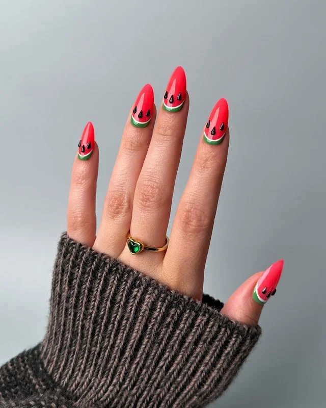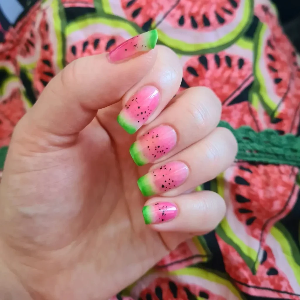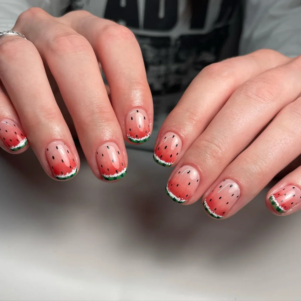 These nails are designed to look like real watermelon slices, featuring a gradient that blends from soft pink to juicy red. Small black seeds are scattered across the nails for a realistic fruity effect. The tips are finished with green stripes that resemble the rind, creating a natural balance.