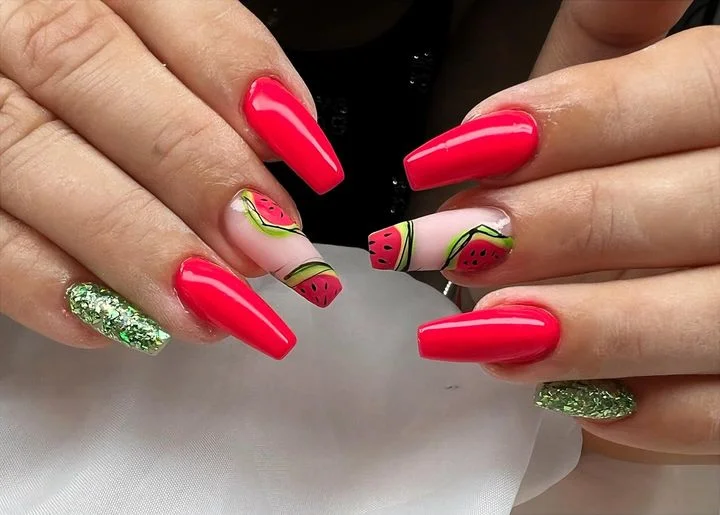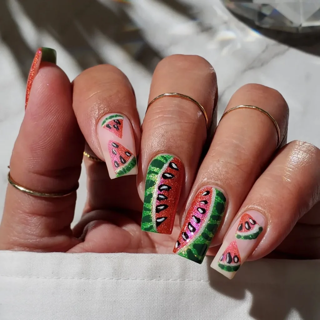 These bold square nails combine glossy red polish with nude accent nails featuring painted watermelon slices. Green glitter nails add a sparkling touch, complementing the fruity design. Each slice is detailed with rind outlines and black seeds, giving the design a lively and playful vibe.
