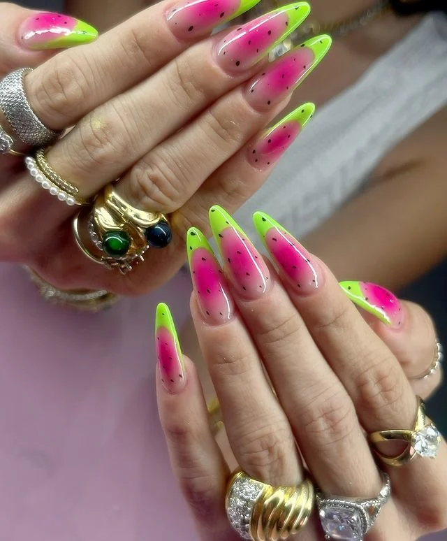 A striking neon ombre design flows from soft pink at the base to hot pink and green at the tips. Black seed details scattered across the pink areas create a clear watermelon vibe while keeping the look sleek. The stiletto shape amplifies the edgy style, making these nails both playful and fashion-forward.