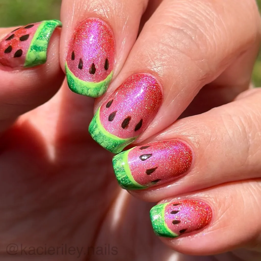 These shimmering nails feature a pink glitter base topped with black seeds for a juicy watermelon look. Each tip is designed with detailed green rind artwork, blending dark and light greens for depth. The sparkly finish catches the light beautifully, making them eye-catching even at a distance.