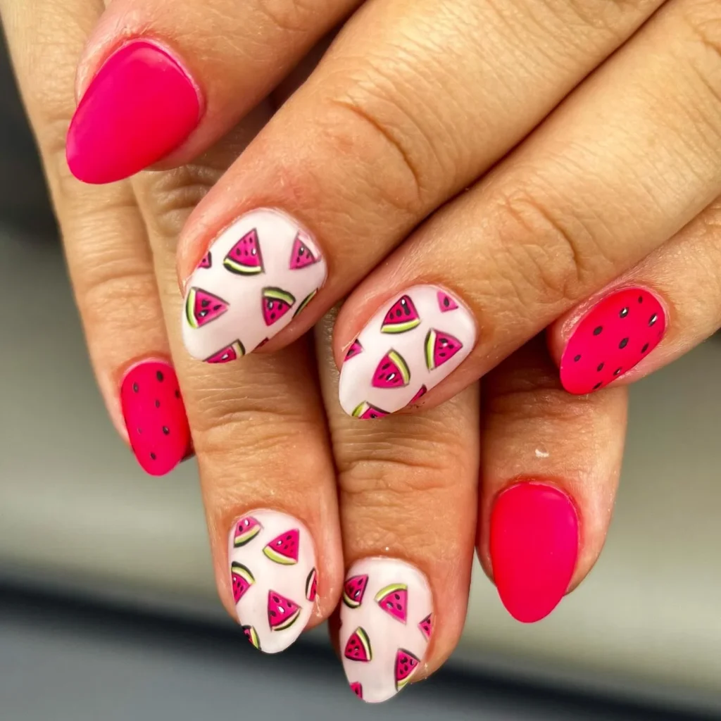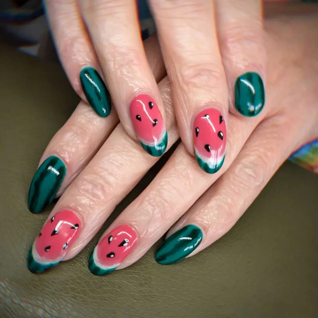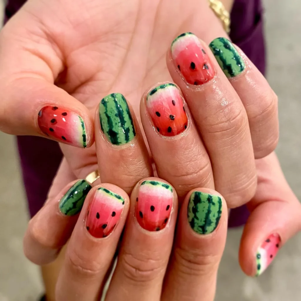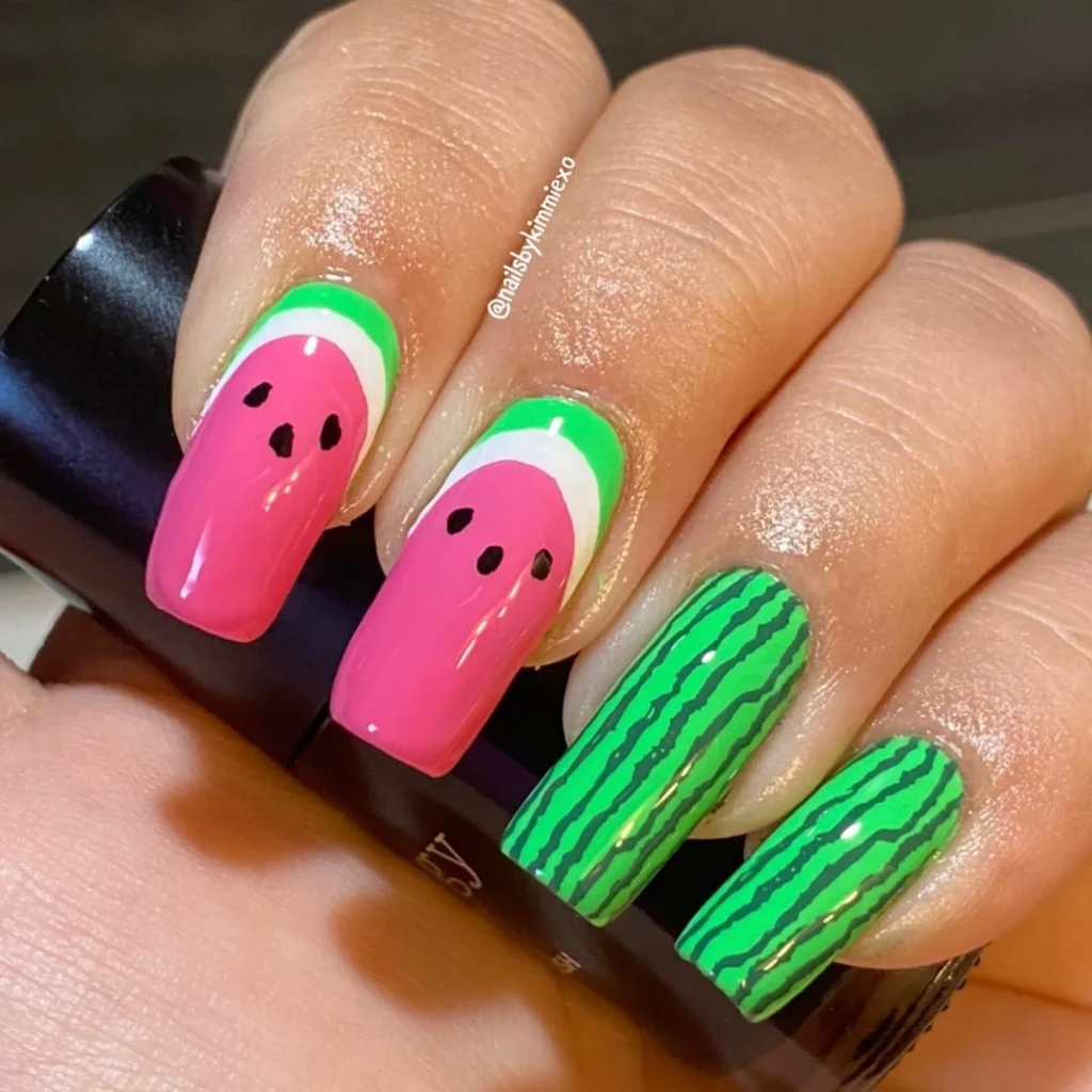 Bold and fun, these nails showcase a cartoon-like watermelon slice design in vivid pink, green, and white. Black seeds are painted simply to emphasize the playful, minimalistic style. Two nails are designed with green stripes resembling the outer rind, tying the look together.