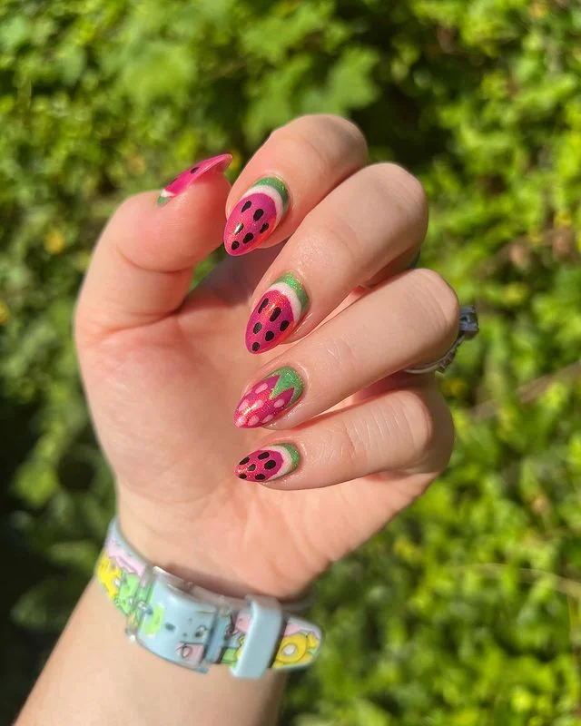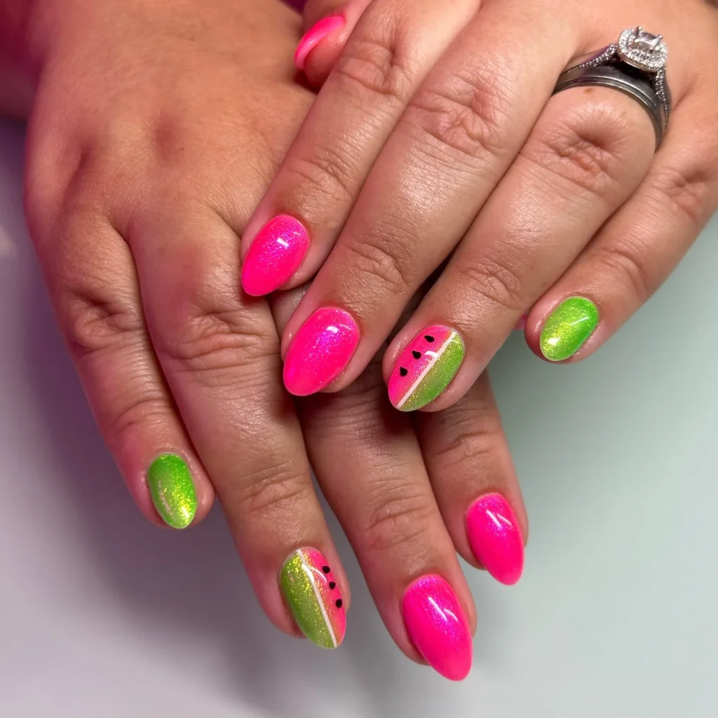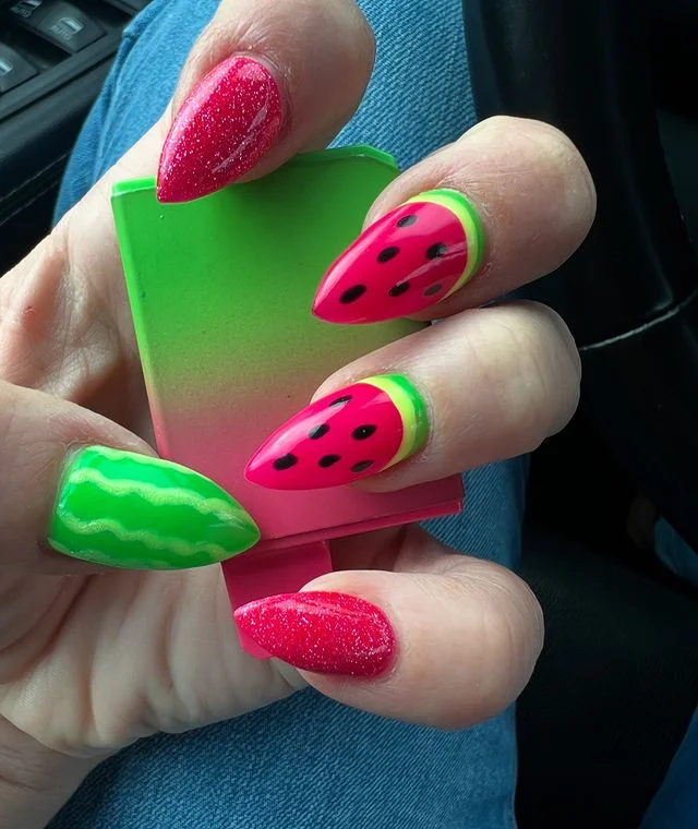A playful mix of neon pink and vibrant green creates the base of this fruity manicure. Some nails are covered in pink glitter polish, while others feature watermelon-inspired tips with rind details and seed accents. The glossy top coat enhances the shine, making the colors pop under any light.