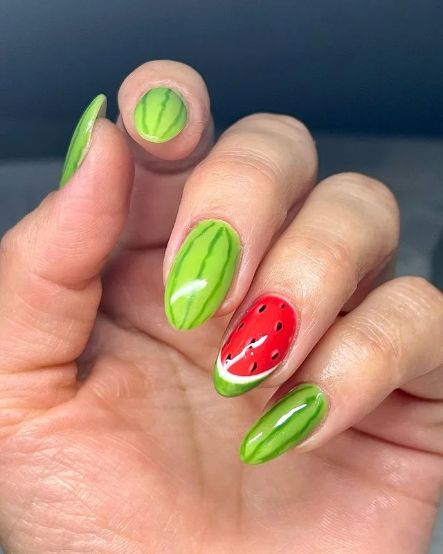 These nails mimic the look of watermelon skin with glossy green striped designs across most fingers. One standout accent nail features a realistic watermelon slice, with red center, rind edge, and tiny black seeds. The simple yet effective contrast between the solid green and the fruity accent creates balance.