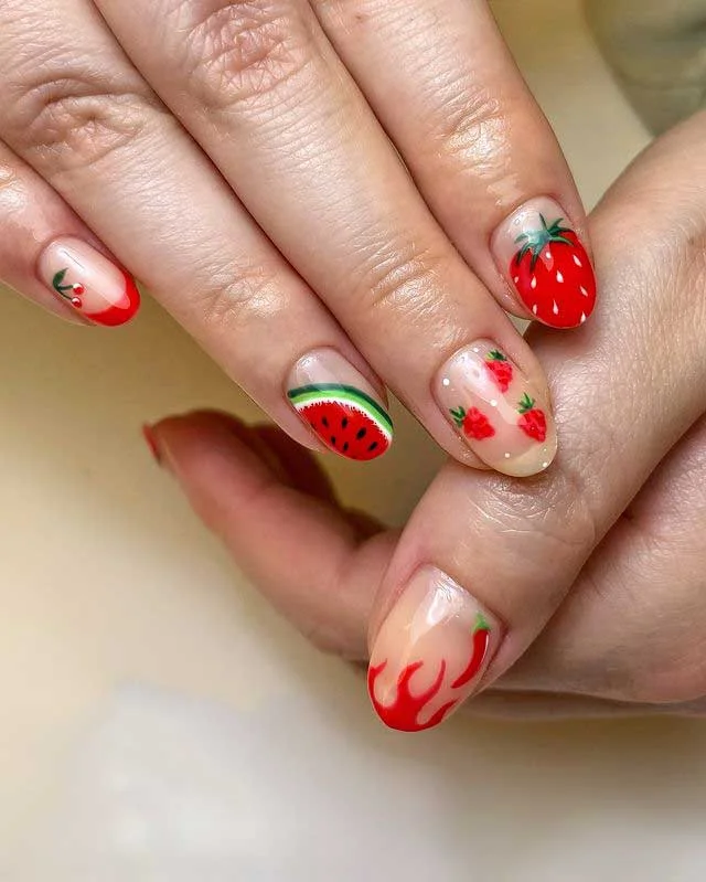 These nails bring variety by mixing watermelon slices with other fruity accents. One nail features a watermelon slice with rind and seeds, while others include strawberries, cherries, and even tiny flame-inspired designs. The nude base keeps the artwork balanced, ensuring the bold fruit colors stand out.