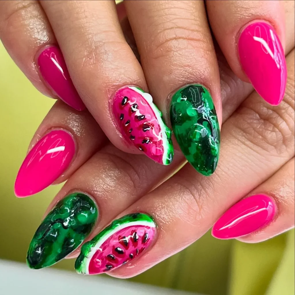 These nails feature a bold mix of glossy pink and green with raised, textured watermelon slice accents. The 3D effect makes the fruit details look realistic, complete with tiny black seeds for depth. The vibrant colors pop under the glossy finish, giving the design a juicy and eye-catching appeal.