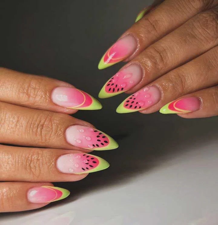 A striking neon ombre blends pink into bright green tips, creating a vibrant watermelon-inspired palette. Black seed details are carefully placed on the pink area, adding playful contrast to the neon tones. Subtle water droplet effects are included on top, making the nails look juicy and three-dimensional.