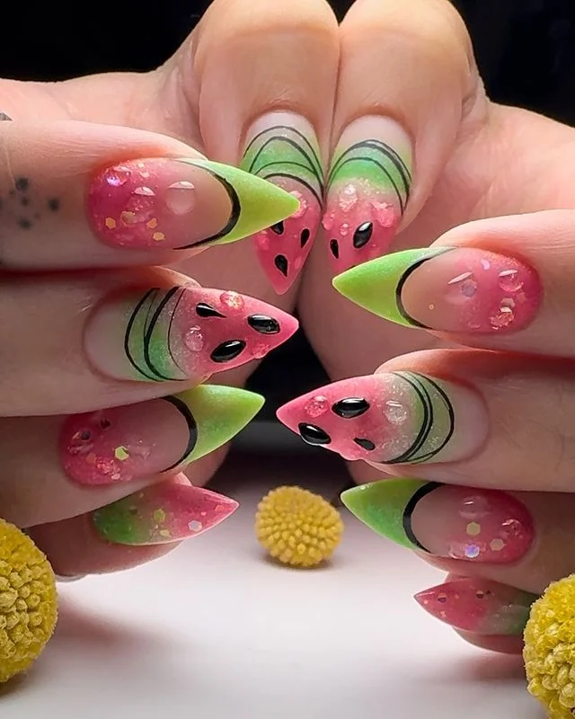 These dramatic stiletto nails combine bright pinks, greens, and bold black seeds in a watermelon-inspired design. Glitter accents scattered across the surface bring sparkle, giving the look a more glamorous edge. Soft gradients between the pink and green mimic the natural shades of the fruit, while the elongated pointed tips amplify the style.