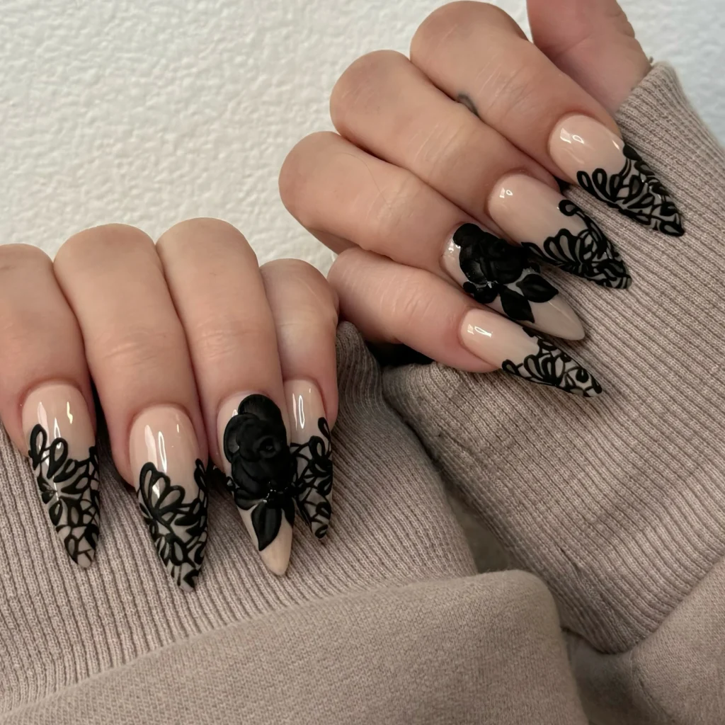 Bold and elegant, these nude stiletto nails feature intricate black lace detailing that extends dramatically over the pointed tips. Each lace pattern has a unique floral flow, adding visual depth and allure. The highlight is the 3D black rose accent with sculpted petals and leaves, giving the design a textured, high-fashion edge.