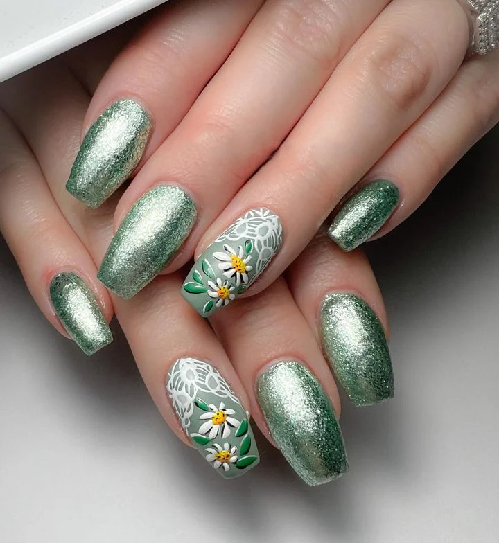 Refreshing and artistic, these nails combine a shimmering metallic green polish with accent nails that feature hand-painted white lace and daisies. The floral accents are intricately detailed, with yellow centers and layered petals adding depth. The lace pattern acts as a delicate frame around the flowers, blending elegance with a touch of countryside charm.